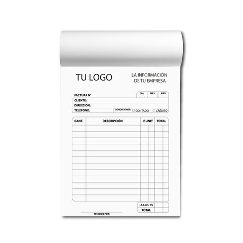 - 2 Libretas de facturas (50 juegos de original y una copia tamaño media página en papel químico cada libreta).