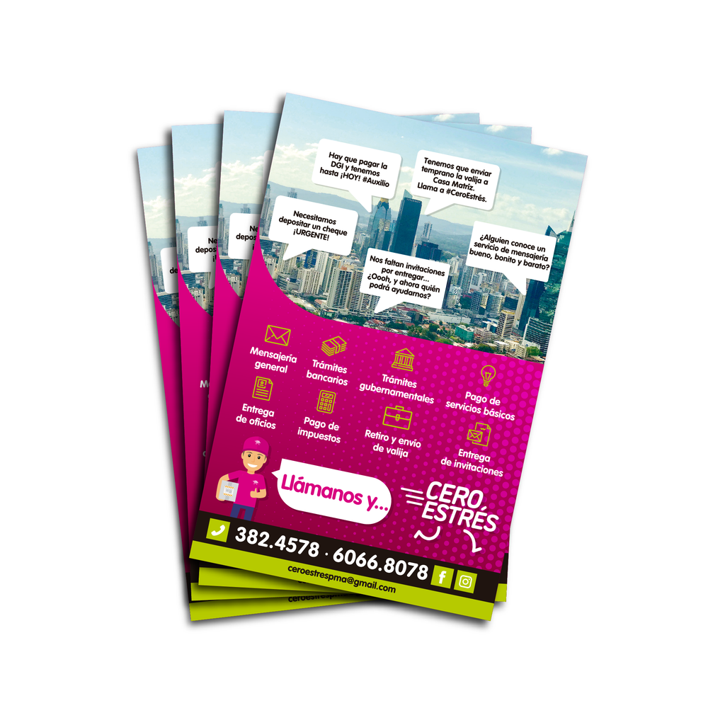 - 100 volantes tamaño media carta impresas a full color en papel satinado de 100lb por un solo lado. (Se incluye un diseño básico, el cliente puede enviar su propio diseño)